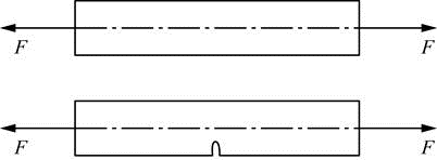 两根相同的脆性材料等截面直杆,其中一根有沿横截面的微小裂纹(如图示)。承受图示拉伸载荷时,有微小裂纹的杆件比没有裂纹杆件承载能力明显降低。其主要原因是( )。