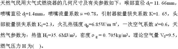 天然气民用大气式燃烧器的几何尺寸及有关参数如下:喷嘴直径dj=1.4mm,喷嘴流量系数μ=0.78,燃气压力H=1496Pa,喉