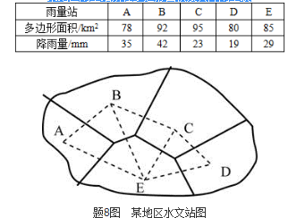 某地区有5个雨量站,如附图所示。将各雨量站用虚线连接,其垂直平分线以细实线表示,各垂直平分线与流域边界线构成多边形的面积以及各雨量站的降雨量如表所示。则用泰森多边形法计算出本地区平均降雨量为( )。 某地区雨量站所在多边形面积及其降雨量表