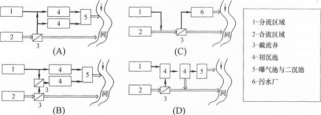 对于合流制与分流制并存的城市,当污水处理厂的二级处理设备的能力有限时,下图中的管渠系统连接方式,错误的是哪些图示?( )