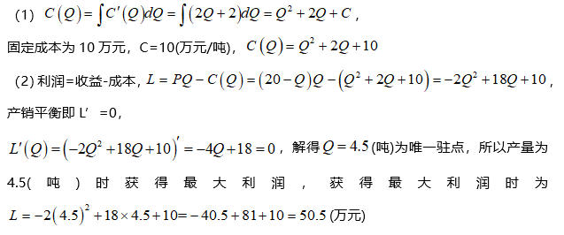 (2)若售价P=20-Q(万元/吨),问产销平衡时,生产多少产品可获最大利润?最大利润是多少?