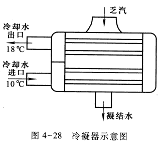 一台功率为20000kW的汽轮机,其耗汽率d=1.32×10-6kg/J。从汽轮机排出的乏汽参数p2=0.004MPa、x2=0.9。乏汽进入冷凝器后凝结为冷凝水。冷凝器中的压力设为0.004MPa,即等于乏汽压力。冷凝水的温度等于乏汽压力下的饱和温度,乏汽在凝结时放出热量。这些热量为冷却水所吸收,因此冷却水离开冷凝器时的温度高于进入时的温度。设冷却水进入冷凝器时的温度为10℃,离开时温度为18℃,求冷却水每小时的流量(t/h)。冷却水在管内流动,乏汽在管壁外凝结,如图4-28所示。管子通常用黄铜管(大型冷凝器中装有数千根黄铜管)。
