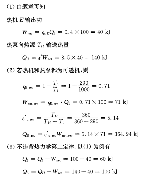 如图5-35所示,在恒温热源T1和T0之间工作的热机作出的循环净功Wnet正好带动工作于TH和T0之间的热泵,热泵的供热量QH用于谷物烘干。已知T1=1000K、TH=360K、T0=290K、Q1=100kJ,(1)若热机效率ηt=40%,热泵供暖系数ε’=3.5,求QH;(2)设E和P都以可逆机代替,求此时的QH;(3)计算结果QH>Q1,表示冷源中有部分热量传入温度为TH的热源,此复合系统并未消耗机械功,将热量由T0传给了TH,是否违背了第二定律?为什么?
