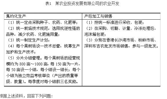 2012年,某农业投资发展有限公司与A村村委会签定了租地合同,约定将该村生态环境良好、集中连片的800亩果树地块以1000元/亩租用20年;同时,每户村民以相同价格与村委会签合同,把土地租给村委会。该地块原本由每户村民家庭承包,每户1~2亩地分散种植水稻或果树。该公司租用土地后进行大规模的设施农业开发,实行工厂化、集约化生产方式,产后加工与销售一体化,具体如表1所示。所有农民工接受统一技术培训;公司统一为农民工免费提供吃饭、住房、电、水等基本生活条件;每个菜场就业的农民,年均工资收入在8000~10000元之间。