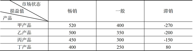 某洗衣机生产企业通过行业分析发现,洗衣机市场已经趋于饱和,销售额难以增长,行业内部竞争异常激烈,中小企业不断退出,行业由分散走向集中。该企业一方面加强内部成本控制,以低成本获得竞争优势;另一方面,该企业积极研发新型产品,推出具有特色的内衣洗衣机,受到消费者的青睐。与此同时,为了扩大企业利润,该企业积极进军手机行业,推出自主品牌的手机产品。新型手机产品方案共有甲产品、乙产品、丙产品和丁产品四种方案可供选择,每种产品方案均存在着畅销、一般、滞销三种市场状态,对应的市场状态及损益值如表1所示(单位:万元)。