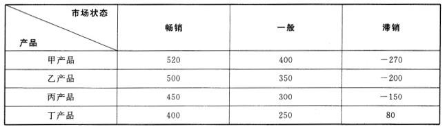某洗衣机生产企业通过行业分析发现,洗衣机市场已经趋于饱和,销售额难以增长,行业内部竞争异常激烈,中小企业不断退出,行业由分散走向集中。该企业一方面加强内部成本控制,以低成本获得竞争优势;另一方面,该企业积极研发新型产品,推出具有特色的内衣洗衣机,受到消费者的青睐。与此同时,为了扩大企业利润,该企业积极进军手机行业,推出自主品牌的手机产品。新型手机产品方案共有甲产品、乙产品、丙产品和丁产品四种可供选择,每种产品方案均存在着畅销、一般、滞销三种市场状态,对应的市场状态即损益值如下表所示(单位:万元)