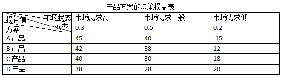 某服装加工企业通过大规模的并购活动,兼并多家中小服装企业,大幅提升了生产规模和市场占有率,为了降低产品成本,该企业进军纺织行业,自主生产服装面料。但是,目前服装加工行业市场趋于饱和,内部竞争异常激烈,许多小企业逐步被淘汰,行业由分散走向集中,因此,该企业决定进军家电行业,成立空气净化器事业部,生产和销售空气净化器,进行新产品经营决策。该企业共有A产品、B产品、C产品、D产品四种空气净化器产品方案可供选择,每种产品均存在着市场需求高、市场需求一般、市场需求低三种市场状态,对应的市场状态及其概率、损益值(单位:百万元)如下表所示: