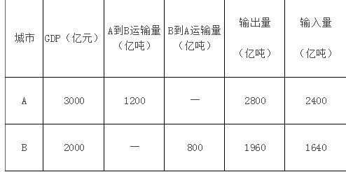 <p>某地区 A、B两个中心城市有关数据如下表所示,试计算两市间的运输联系强度Hab( )。 <img alt="" src