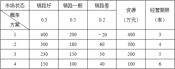 某公司10年来一直只生产电视机显像管,产品质量较高,经营状况良好。2020年该公司与某电视机生产企业联合,开始生产电视机成品,拟生产3种不同型号的电视机产品,有4个备选方案,每个方案的投资额、经营期限、市场状态和收益值如表1-8所示。