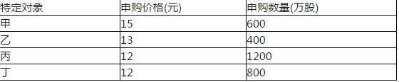 上市公司非公开发行股票,发行股票价格不低于12元/股,发行数量不高于2000万股,募集资金2.4亿元。按照价格优先、数量优先的原则确定发行对象。特定对象甲乙丙丁申报价格和数量如下表: 则下列配售情况正确的是( )