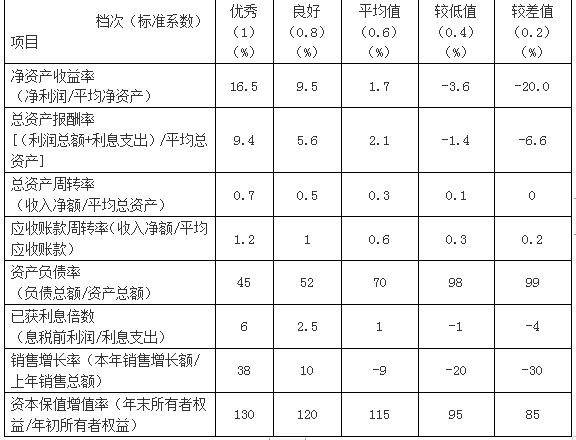A公司的净资产收益率为8%;该净资产收益率已达到“平均值”档(1.7%)水平。可以得到基础分;它处于“良好”档(9.5%)和“平均值”档(1.7%)之间,需要调整。 本档基础分=指标权重×本档标准系数=20×0.6=12(分) 功效系数=(实际值-本档标准值)/(上档标准值-本档标准值)=(8%-1.7%)÷(9.5%-1.7%)=0.8077 调整分=功效系数×(上档基础分-本档基础分)=0.8077×(20×0.8-20×0.6)=0.8077×4=3.23(分) 净资产收益率指标得分=12+3.23=15.23(分)
