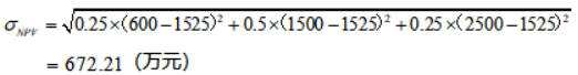 预期NPV=0.25×600+0.5×1500+0.25×2500=1525(万元) 标准差:“偏差平方的预期值”再开方。