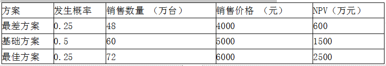 方舟科技公司销售个人电脑业务,一般情况下售价平均5000元,年销售量60万台。如果市场条件比较好,销售价格在6000元时销量可以达到72万台,如果市场条件不好,销售价格在4000元时销售量也只有48万台。各种情况发生的概率、销售数量和价格如表所示。