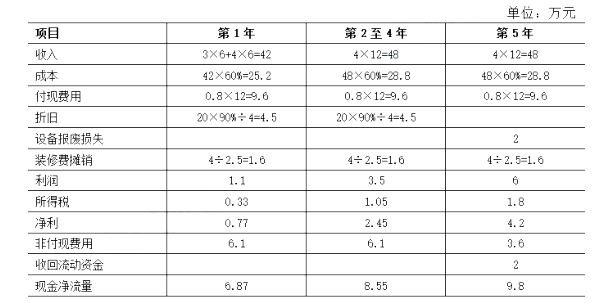 某人准备开设一个彩扩店,通过调查研究提出以下方案: (1)设备投资:扩冲设备购价20万元,预计可使用5年,报废时无残值收入;按税法要求该设备折旧年限为4年,使用直线法折旧,残值率为10%;计划在2015年7月1日购进并立即投入使用,设备报废损失2万。 (2)门店装修:装修费用预计4万元,在装修完工的2015年7月1日支付。预计在2.5年后还要进行一次同样的装修。 (3)收入和成本预计:预计2015年7月1日开业,前6个月每月收入3万元(已扣除营业税,下同),以后每月收入4万元;耗用相纸和冲扩液等成本收入的60%;人工费、水电费和房租等费用每月0.8万元(不含设备折旧、装修费摊销)。 (4)营运资金:开业时垫付2万元。 (5)所得税率为30%。 (6)业主要求的投资报酬率最低为10%。 要求:计算现金净流量。