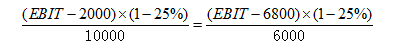G公司总资产80000万元,举债20000万元,债务利率10%,所得税税率为25%。G公司发行在外普通股数为6000万股,以10元/股发行价格募集资本60000万元。公司拟于下一年度投资某新项目,投资总额达40000万元。现有两种融资方案:(1)增发普通股4000万股(发行价不变);(2)向银行借款40000万元,且新增债务利率因资产负债率提高而上升到12%。 假定新项目预计的息税前利润为15000万元。 要求:采用EBIT-EPS无差异分析法,对融资方案进行选择。