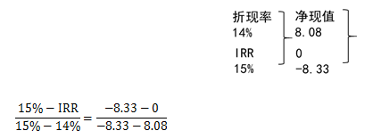 NPV=500×(P/F,i,1)+400×(P/F,i,2)+300×(P/F,i,3)+100×(P/F,i,4)-1000=0 采用试误法(逐步测试法): (1)使用15%进行测试:NPV=-8.33 (2)使用14%进行测试:NPV=8.08 经过以上试算,可以看出该方案的内含报酬率在14%~15%之间。采用内插法确定: 解之得:IRR=14.49%