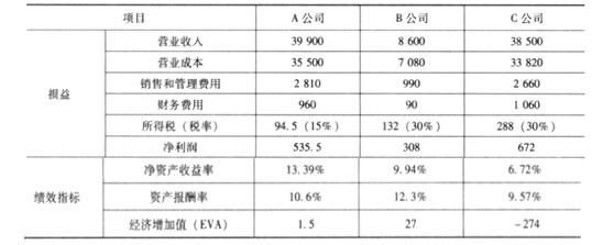 某集团公司拥有全资控股的A、B、C三家子公司,其中A公司主营整车生产,B公司主营汽车零部件生产,C公司专营A公司的全部整车销售与售后服务。集团公司每年对A、B、C公司经理层进行绩效评价。假设A、B、C公司2005年度的有关财务数据如下表: