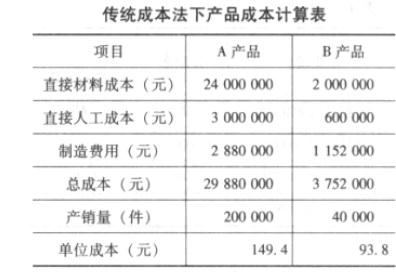 按传统成本法,制造费用可直接按机器制造工时进行分配。 制造费用分配率=4032000/(400000+160000)=7.2 A 产品应负担的制造费用=400000*7.2=2880000(元) B 产品应负担的制造费用=160000*7.2=1152000(元) 以上计算结果可编制产品成本计算法,如下表所示。