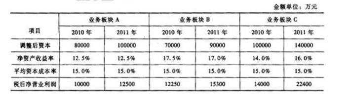 甲公司是一家大型高科技集团上市公司,主营手机、电脑及其他电子科技产品。其生产、研发与销售部门遍及全球各地。产品特征与类型具有一定的地理特殊性,该公司的发展战略是系列电子产品多元化,从多板块、多渠道取得效益。甲公司重视研究开发,持续推出新产品,不断创新产品配套服务,以此推动消费者对产品进行升级,提高产品边际收益。近年来,公司财务战略目标日益明晰,高度重视企业价值管理,构建了以经济增加值最大化为核心目标,持续盈利能力和长期现金流量现值为辅助目标的财务战略目标体系。按照财务战略目标要求,2011年甲公司在2010年的基础上,对部分业务板块追加了投资,其中业务板块A和业务板块B各追加投资10000万元,业务板块C追加投资20000万元,三个业务板块的基础财务数据见下表:
