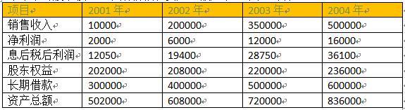2001年至2004年,公司实现的销售收入、净利润和息前税后利润,以及每年年末的股东权益、长期借款和资产总额如下(单位:万元):