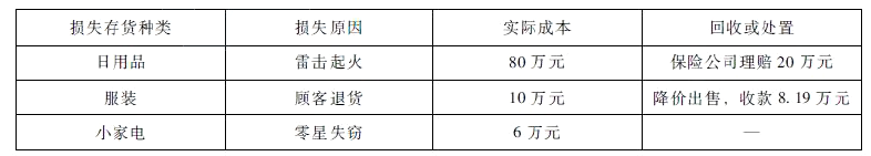 ( 1)小家电零星失窃应作进项税额转出处理;转出的进项税额=6 x 16%=0.96 (万元); 其他的存货损失无须作进项税额转出处理。 (2)①a企业发生的损失,减除责任人赔偿和保险赔款后的余额,依照国务院财政、税务主管部门]的规定扣除。故日用品损失在企业所得税税前扣除时申报扣除金额=80--20=60(万元)。 b.服装损失在企业所得税税前扣除时申报扣除金额=10- -8.19+ ( 1+16%) =2.94 (万元)。 c.小家电损失在企业所得税税前扣除时申报扣除金额=6+6x16%=6.96(万元)。, ②a.商业零售企业存货因零星失窃、报废、废弃、过期、破损、腐败、鼠咬、顾客退换货等正常因素形成的损失,为存货正常损失,准予按会计科目进行归类、汇总,然后再将汇总数据以清单的形式进行企业所得税纳税申报,同时出具损失情况分析报告。 故采取清单申报扣除的有:服装损失、小家电损失。 b.商业零售企业存货因风、火、雷、震等自然灾害,仓储、运输失事,重大案件等非正常因素形成的损失,为存货非正常损失,应当以专项申报形式进行企业所得税纳税申报。故采取专项申报扣除的是日用品损失。 (3)企业资产损失相关的证据包括具有法律效力的外部证据和特定事项的企业内部证据。
