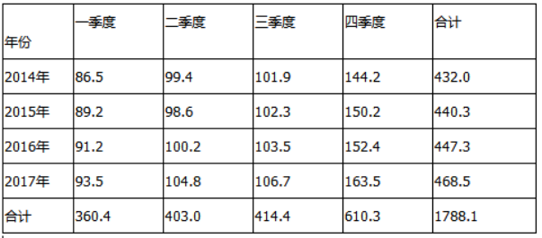 在时间数列的季节变动分析中常常要用季节指数法进行分析。下表中是某产品2014—2017年期间的各季销售数据。? 请用季节指数法对其进行分析并回答下列问题。? 根据上表数据,计算出该产品第四季度的季节比率是()