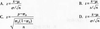 小样本情况下,当总体服从正态分布,总体方差未知时,总体均值检验的统计量为( )