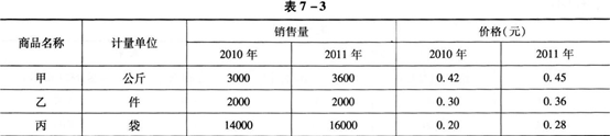 某商店三种商品销售如表7—3所示。 请根据上述资料,回答86-90题分析该商店2011年比2010年三种商品销售量和价格的变化情况,并分析其中由于销售量及价格变动对销售额的影响。 综合来看,由于三种商品的销售量和价格的变动使得销售额的变动( )。查看材料
