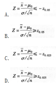已知总体方差,显著性水平a=0.05,检验的假设为:H0:μ≤μO,H1:μ>/μ0,则检验的拒绝域应为( )。