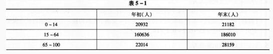 表5—1为某地区2008年的人口数。 注1:0~14为少年儿童人口 注2:65以上为老年人口 请据此表计算回答以下81-85题: 该地区2008年的平均人口为( )。