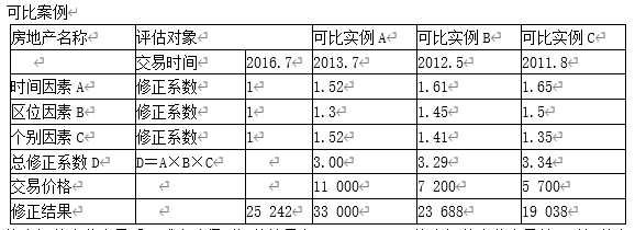 资产评估专业人员对评估对象与交易案例之间的时间因素、区位因素和个别因素差异进行了修正,得到了修正后的资产评估结果,并以3个修正后的评估结果的算术平均数作为市场法的评估值,评估单价为25242元/m2,修正情况与评估结果如下表所示。