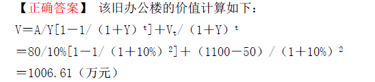 某出租的旧办公楼的租约尚有2年到期,在此最后2年的租期中,每年可收取净租金80万元,到期后要拆除作为商业用地。预计作为商业用地的价值为1100万元,拆除费用为50万元,该类不动产的报酬率为10%。 、请计算该旧办公楼的价值。