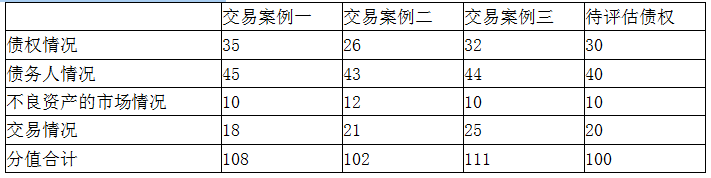 被评估对象与这三个可比交易案例从债权情况、债务人情况、不良资产的市场情况、交易情况等方面进行比较、量化打分,得到交易案例比较法因素调整表如下所示:
