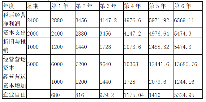 A公司今年年初的金融资产市场价值为200万元,经营营运资本为5000万元,发行在外的普通股为500万股,去年销售收入15000万元,税前经营利润4000万元,资本支出2000万元,折旧与摊销1000万元。今年年初金融负债的市场价值为3000万元,资本结构中负债占20%,可以保持此目标资本结构不变,负债(平价发行债券、无手续费)平均利率为10%,可以长期保持下去。平均所得税税率为40%。今年年初该公司股票每股价格为40元。 预计未来5年的销售收入增长率均为20%。该公司的资本支出、折旧与摊销、经营营运资本、税后经营净利润与销售收入同比例增长。第6年及以后经营营运资本、资本支出、税后经营净利润与销售收入同比例增长,折旧与摊销正好弥补资本支出,销售收入将会保持10%的固定增长速度。 已知无风险报酬率为2%,股票市场的平均报酬率为10%,公司股票的β系数为2.69。 、填写下表,计算分析投资者今年年初是否应该购买该公司的股票作为投资(假设净负债价值等于基期净负债,加权平均资本成本的计算结果四舍五入保留至百分之一)。