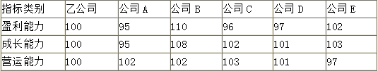 根据乙公司所在行业特点,经分析选择P/E作为价值比率。5家公司在盈利能力、成长能力、营运能力方面与乙公司存在一定差异,经指标差异对比得出“价值比率调整指标评分汇总表”(表2)。