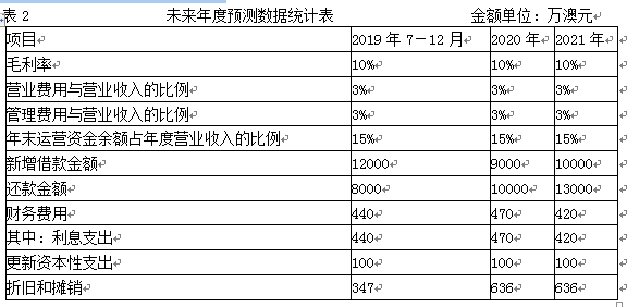 评估专业人员经过调查分析,预测乙公司2019年的营业收入增长率与前三年营业收入增长率的算术平均数持平,另外,根据乙公司管理层的介绍,由于乙公司的出口产品一直供不应求,乙公司计划在2019年投资4000万澳元新上一条生产线,预计2020年营业收入可以增加到50000万澳元,2021年营业收入达到60000万澳元,2022年起进入稳定增长期,永续价值为21666.21万澳元,乙公司所得税率为30%,其他预测数据如下表所示: