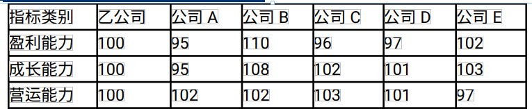 根据乙公司所在行业特点,经分析选择P/E作为价值比率。5家公司在盈利能力、成长能力、营运能力方面与乙公司存在一定差异,经指标差异对比得出“价值比率调整指标评分汇总表”