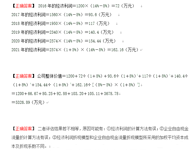 甲公司评估基准日为2016年1月1日,基准日投入资本1200万元,预计2017-2020年投入资本为1560万元、1950万元、2340万元、2574万元,此后每年投入的增长率为5%,投入资本报酬率为14%,无风险报酬率3%,市场平均报酬率为8%,公司β系数为1.2,公司特定风险1%,税前债务资本成本为8%,公司目前的资产负债率为0.5且预计保持不变,假设公司收益期无限。 <1>、计算甲公司的股权报酬率和加权平均资本成本。 <2>、分别计算甲公司2016-2021年的经济利润。 <3>、采用经济利润折现模型的资本化公式计算甲公司的整体价值。 <4>、理论上讲,经济利润折现模型和企业自由现金流量折现模型是完全等价的,简述如果二者评估结果不相等的原因是什么。