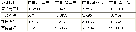 <2>、分别计算阿帕奇石油、康菲石油、新田石油、西南能源的市值/总资产、市值/净资产、市值/营业收入和市值/净利润价值比率。