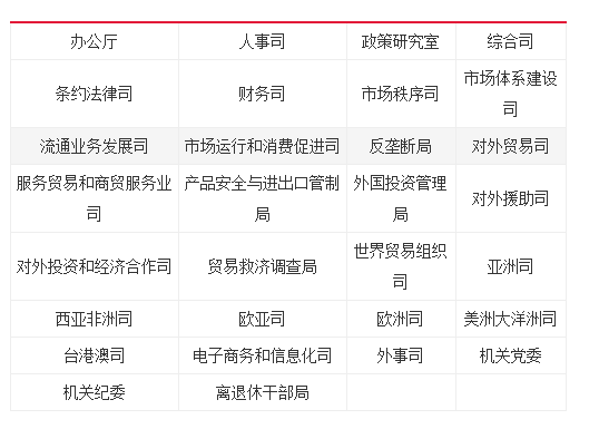 31个内设机构为:商务部下设机构分别是:办公厅(国际贸易谈判代表秘书局),人事司,政策研究室,综合司,条约法律司,财务司,市场秩序司,市场体系建设司,流通业发展司,市场运行和消费促进司(国家茧丝绸协调办公室),反垄断局(国务院反垄断委员会办公室),对外贸易司(国家机电产品进出口办公室),服务贸易和商贸服务业司,产业安全与进出口管制局,外国投资管理司,对外援助司,对外投资和经济合作司,贸易救济调查局,国际经贸关系司,世界贸易组织司(中国政府世界贸易组织通报咨询局),亚洲司,西亚非洲司,欧亚司,欧洲司,美洲大洋洲司,台港澳司,电子商务和信息化司,外事司,机关党委,机关纪委,离退休干部局。