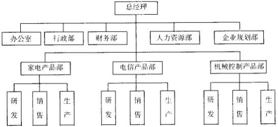 某公司的组织结构如图1所示。总经理直接负责财务部、办公室、党群工作部,并直接管理家电、电信及机械控制产品等3个部门。下设副总经理2名,一名负责企业的行政部、人力资源部,另一名负责技术研发部、质量安全部、销售部。随着公司规模的扩大,公司领导感到现在的组织结构严重制约企业的发展,许多新的问题开始显露,如产品品种和质量无法满足顾客的需要,产品销售出现明显下滑趋势;管理人员人浮于事,工作效率低下;各个部门特别是生产部门与职能部门之间的矛盾和冲突时有发生。公司决策层在咨询了管理专家的意见之后,决定推行事业部制的组织结构模式,对公司的组织结构进行了必要的调整和改革。