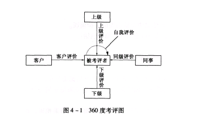 (1)360度考评方法又称为全视角考评方法,它是指由被考评者的上级、同事、下级和客户(包括内部客户和外部客户)以及被考评者本人担任考评者,从多个角度对被考评者进行360度全方位评价,再通过反馈程序,达到改变行为、提高绩效等目的的考评方法,如图4—1所示。