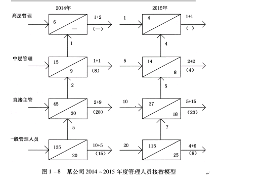 某公司2014~2015年度管理人员变动情况如图1—7所示,2015年度各级管理人员的补充是通过外部招聘的方式来完成的,公司高层在总结本年度人力资源管理工作经验的基础上,做出了以下决策:首先,2016年度除一般管理人员可以通过外部各种招聘渠道补充之外,其他各层次管理人员一律由公司内部选拔;其次,各个层次的管理人员补充需要量严格按照公司制定的定员标准执行,不得突破额定人数;最后,要妥善安排好提升受阻的后备人才。2016年管理岗位人员接替统计表如表1—1所示。