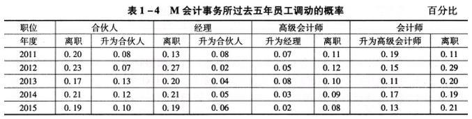 在过去五年中,员工调动的概率如表1—4所示,其中包括各职位人员升迁和离职的百分比率。在升迁部分,各职位除最高合伙人之外,只要表现好,皆有升迁的机会,对于特别优异的高级会计师还有机会直接升为合伙人,只是机会不大;在离职方面,由于人才竞争激烈,每年在各职位上的人员皆有离职的情况。