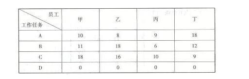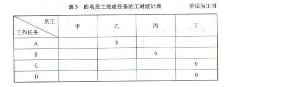 某车间产品装配组有甲、乙、丙、丁四名员工,现有A、B、C三项任务需要完成,在现有生产技术组织条件下,每位员工完成每项工作所需要的工时如表1所示。