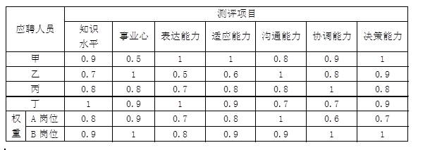 某公司拟招聘两名工作人员,表1是人力资源部通过笔试进行初选之后,对所选出来的甲、乙、丙、丁四名候选人进行综合素质测评的得分,以及A和B两类岗位素质测评指标的权重()