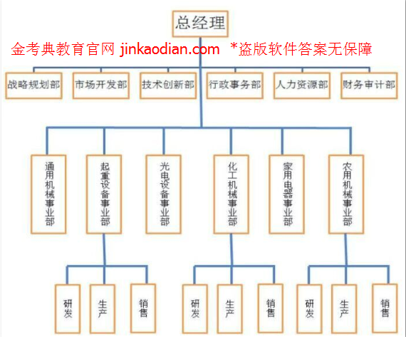 四、方案设计题(18/题,36分) 某大型企业集团主要生产和机营机械电子产品,该集团总部设立了战略规划部、市场开发部、技术创新部、行政事务部、人力资源部和财务审计部等六大职能部门,负责研究和制定集团重大方针政策,掌握投资、重要人事任免。市场经营和监督检查等方面的管控。根据产品的不同,该集团还敲门了六个事业部:通用机械事业部、起重设备事业部、充电设备事业部、化工机械带来部、家用电器带来部和农用机械事业部。各事业部实行独立核算、自负盈亏,并可根据经营需要设置相应的职能部门,各事业部下均设有研发、生产和销售三大部门。 请根据该集团上述组织机构设置的情况,绘制出组织结构框图。(18分) 提示:绘制组织结构图的基本方法 1、一般画4层:1中心层最大,上1层稍小,下2层渐小; 2、功能、职责、权限相同的机构,大小一致,水平并列; 3、命令指挥系统线从上一层垂下来,位置高表示级别高; 4、命令指挥系统线用实线,协作服务关系用虚线; 5、参谋机构用横线与上一层垂线相连,放左、右上方