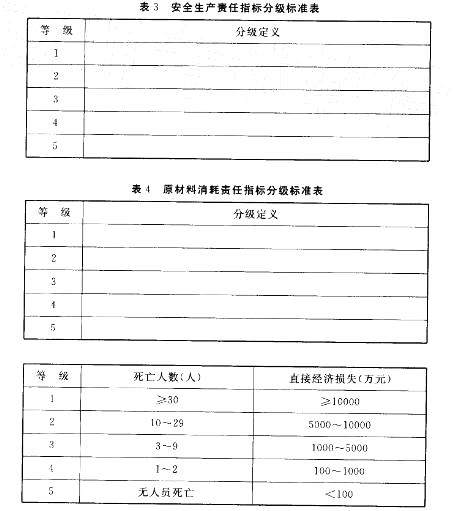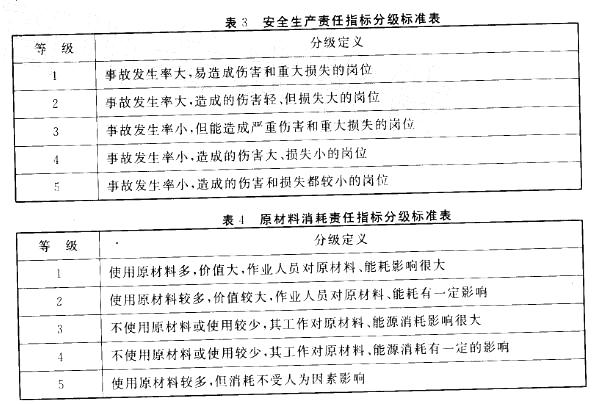 某机械制造企业为了进行岗位工资制度设计,拟对生产岗位进行综合评价。 请您对“安全生产责任”和“原材料消耗责任”两项重要评价指标的分级标准做出设计,填表3和表4中(要求:评价标准划分为五级,并对每个等级做出明确的界定)。
