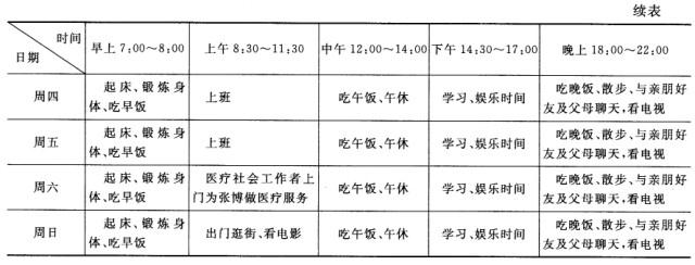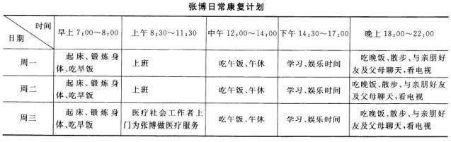 3.出院计划包括进一步治疗和康复计划,计划的内容包括作息时间、治疗时间、散步和锻炼身体时间等。为保证张博的病情彻底康复,特制订出院后为期一年的康复计划。