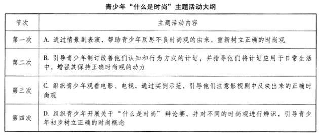 某社区青少年服务机构的社会工作者发现,该社区里有不少青少年以抽烟、喝酒、说脏话为时尚,行为也“匪里匪气”。因此,社会工作者以班杜拉(AlbertBandura)的观察学习历程的步骤顺序,组织了“什么是时尚”的主题活动,改善青少年对时尚的认识。青少年“什么是时尚”主题活动大纲